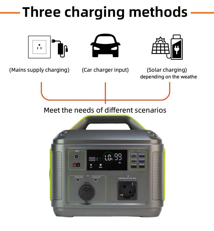 There are many ways to charge the outdoor power supply, mainly divided into solar panel charging (solar to DC charging), utility charging (charging circuit built into the Portable Power Supplies, AC to DC charging), vehicle charging.